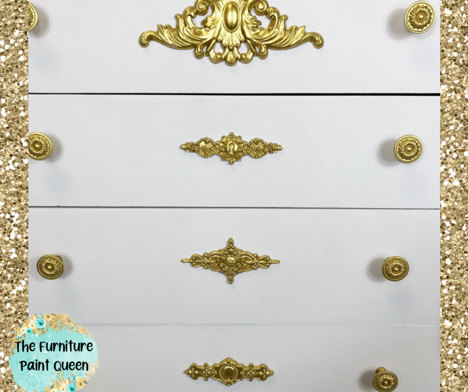 I have kept the original drawer pulls which shimmer in gold metallic for extra pizazz!