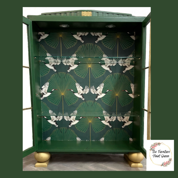 The cabinet is restyled in a bold dark green while shimmering gold details complete the luxury look.